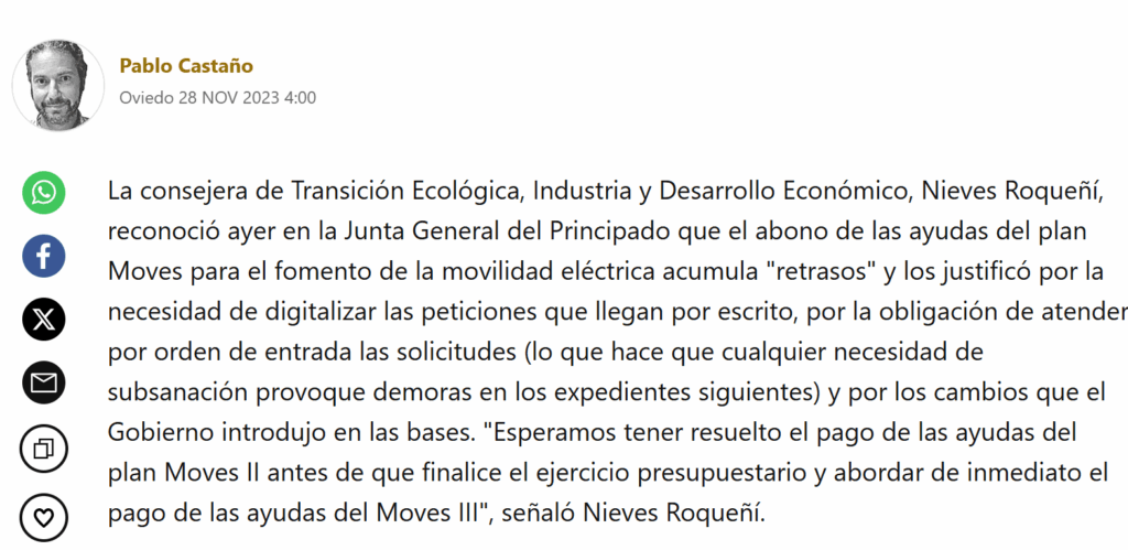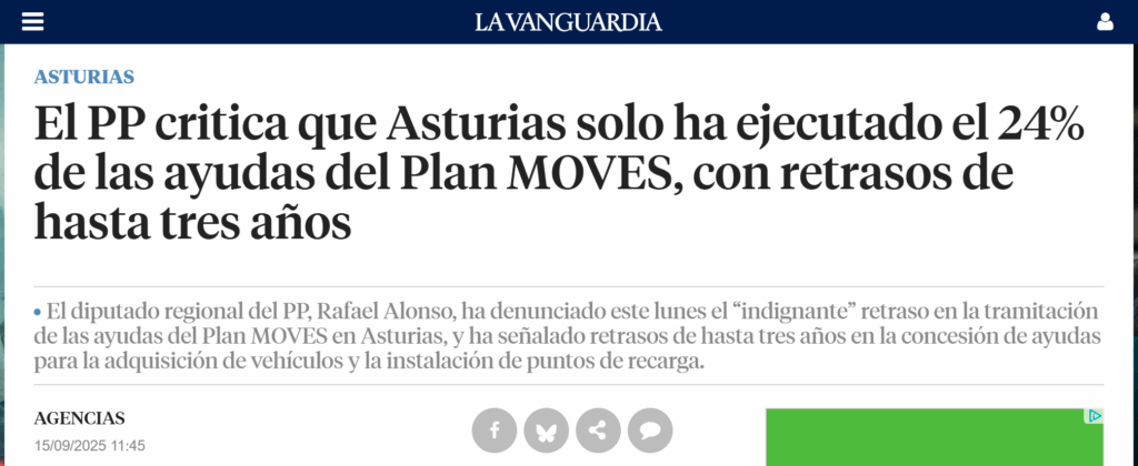 El diputado regional del PP, Rafael Alonso, denuncio en septiembre 2025, el “indignante” retraso en la tramitación de las ayudas del Plan MOVES en Asturias, y señalo retrasos de hasta tres años en la concesión de ayudas para la adquisición de vehículos y la instalación de puntos de recarga.
